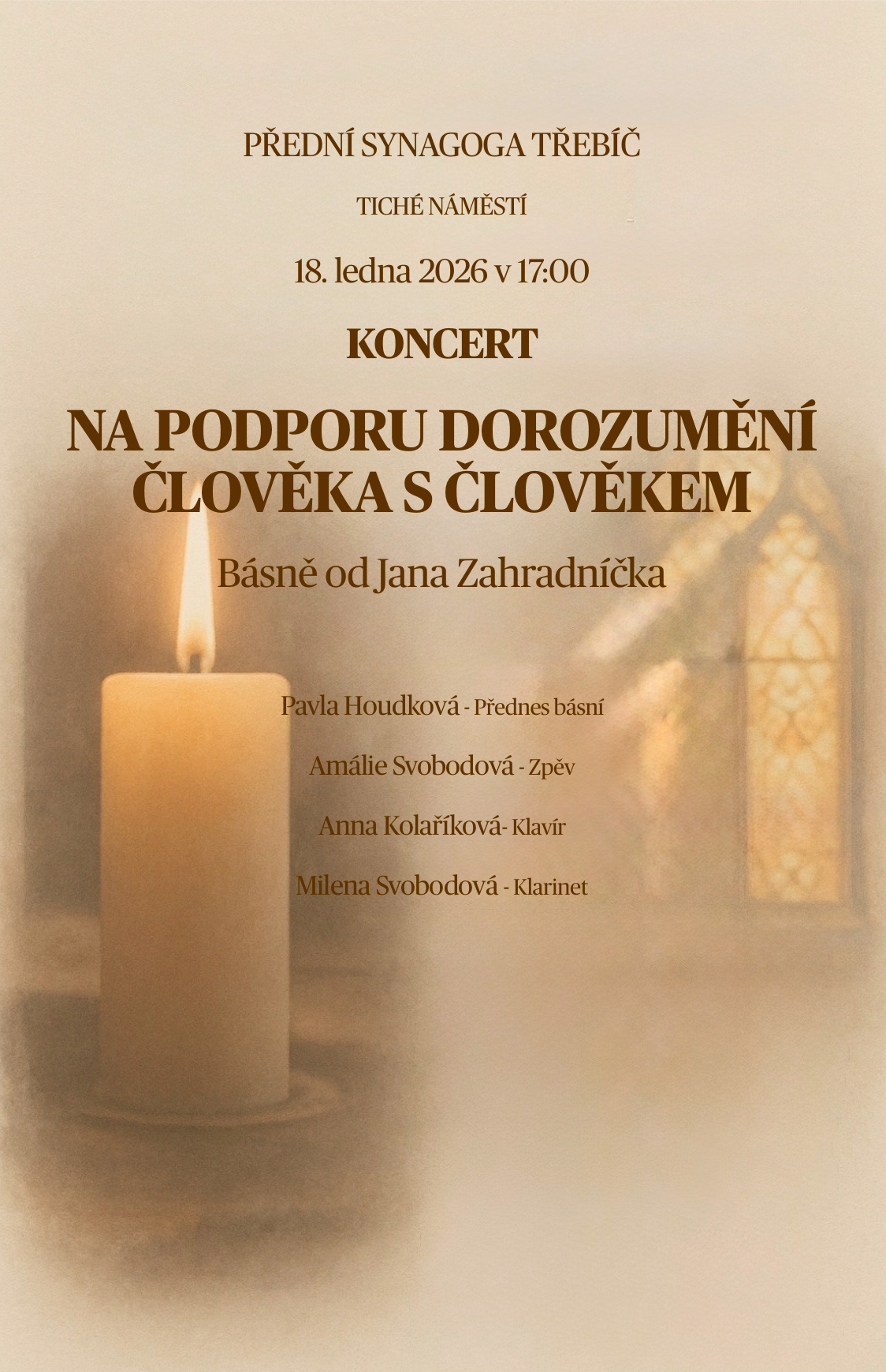 Koncert na podporu dorozumění člověka s člověkem bude večer, při kterém se verše Jana Zahradníčka budou snoubit s hudebním krásnem. Tento program zazněl poprvé v Telči jako oslava Dne boje za svobodu a demokracii. Ti co ho neslyšeli, mají možnost v Třebíči 18. ledna.