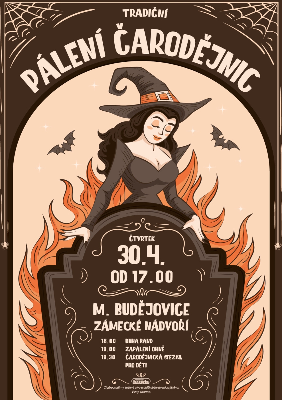 V 19 hodin zapálení ohně. Od 19.30 hodin Čarodějnická stezka pro děti.