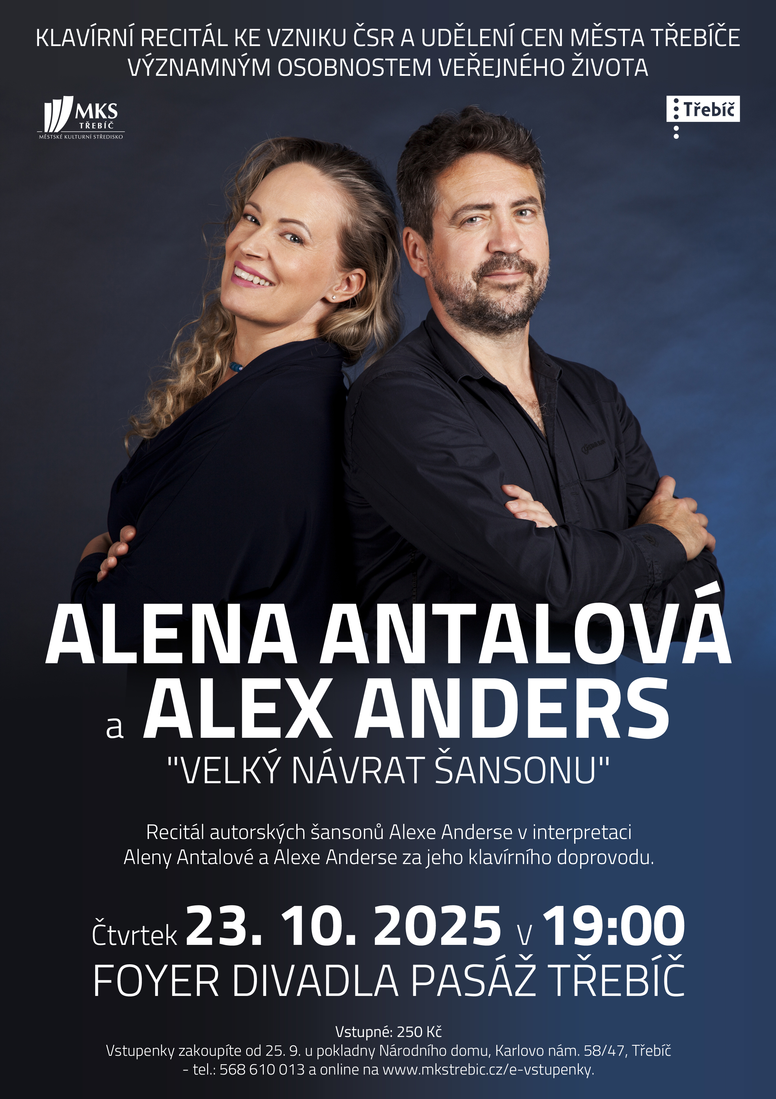 Alena Antalová vystoupí za klavírního doprovodu Alexe Anderse ve čtvrtek 23. 10. 2025 od 19 hodin ve foyer divadla Pasáž při příležitosti Slavnostního večera ke vzniku ČSR a udělení Cen města Třebíče významným osobnostem veřejného života. Nejen milovníci šansonu, ale i příznivci opravdové a upřímné muziky si přijdou na své, kdy vás za srdce chytnou herečka a zpěvačka Alena Antalová a skladatel, textař, zpěvák a pianista Alex Anders. Šansonový recitál bude plný krásných písní o životě.