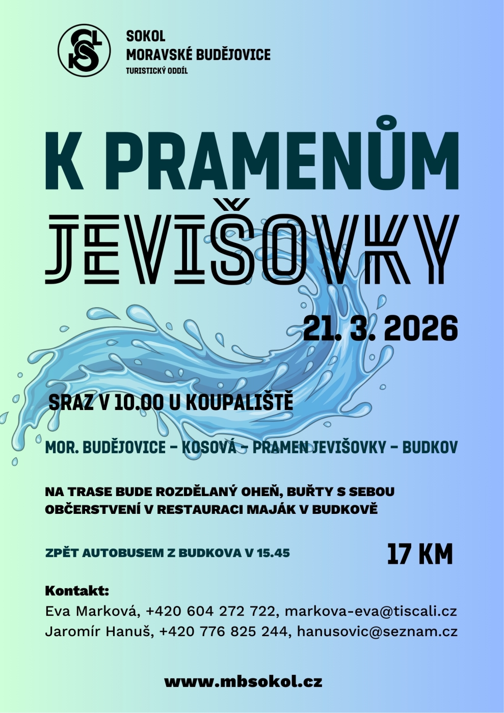 K pramenům Jevišovky Zveme vás na jarní výpravu k pramenům Jevišovky, která se uskuteční v sobotu 21. března 2026. Sraz je v 10:00 u koupaliště, odkud nás čeká 17 km dlouhá cesta probouzející se přírodou přes Kosovou. Nezapomeňte si přibalit špekáčky, na trase společně rozděláme oheň. Návrat je zajištěn autobusem z Budkova v 15:45. Více informací najdete na mbsokol.cz. Přijď-te, těšíme se na Vás!