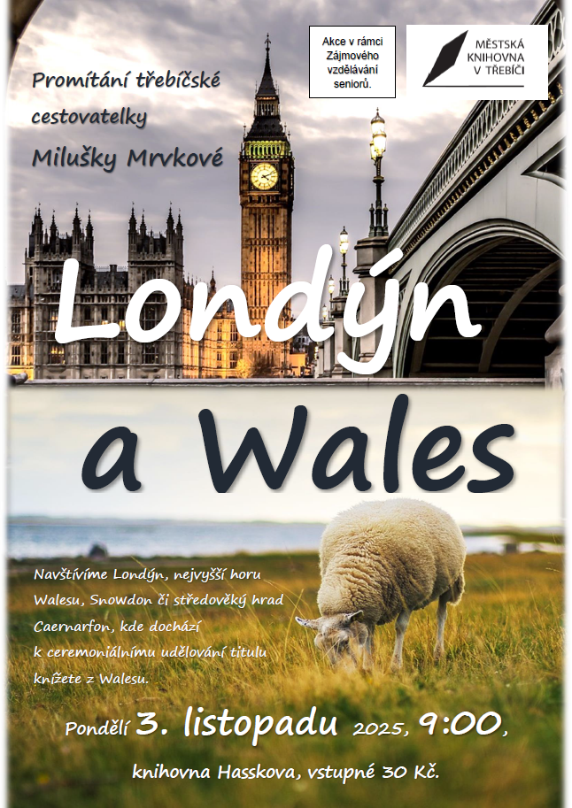 Promítání třebíčské cestovatelky Milušky Mrvkové. Navštívíme Londýn, nejvyšší horu Walesu Snowdon či středověký hrad Caernarfon, kde dochází k ceremoniálnímu udělování titulu knížete z Walesu. Akce se koná v rámci Zájmového vzdělávání seniorů.