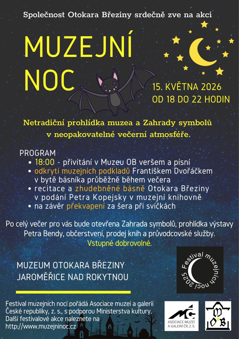 Netradiční prohlídka Muzea Otokara Březiny a Zahrady symbolů v Jaroměřicích nad Rokytnou spojená s kulturním programem. Vstupné dobrovolné.