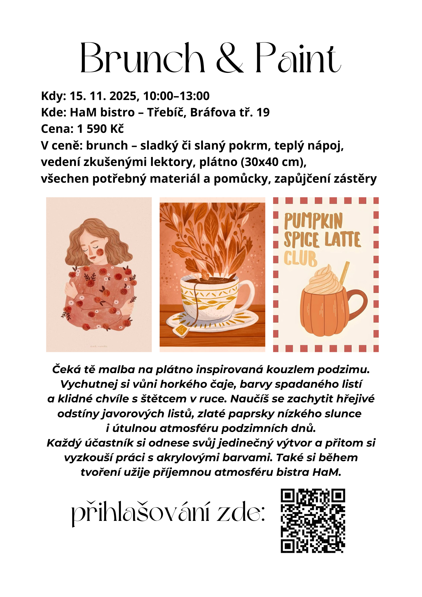 V ceně: brunch – sladký či slaný pokrm, teplý nápoj, vedení zkušenými lektory, plátno (30×40 cm), všechen potřebný materiál a pomůcky, zapůjčení zástěry