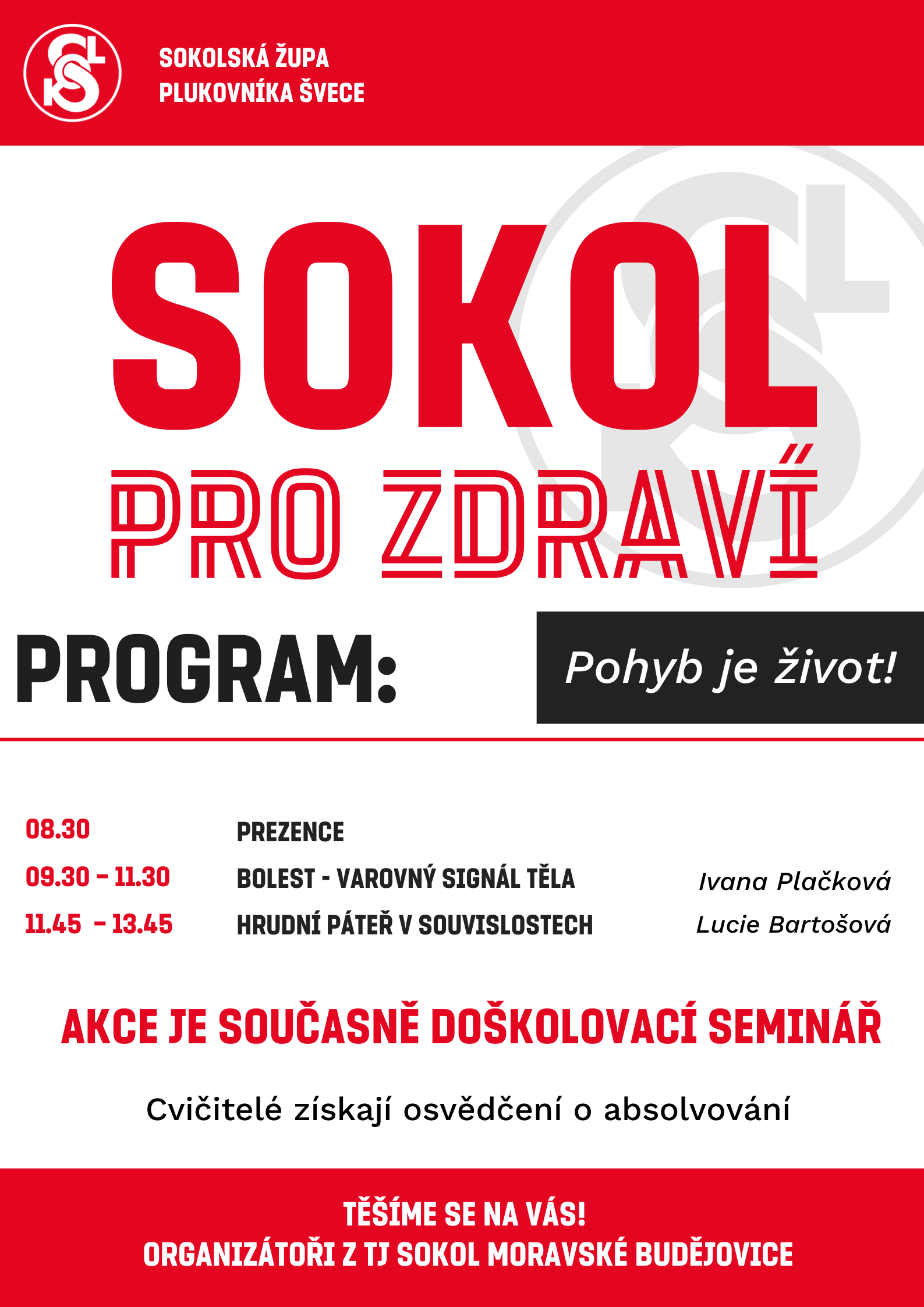 V sobotu 1. listopadu se od 8.30 do 13.45 bude konat podzimní akce Sokol pro zdraví. Tělocvična bude otevřena pro širokou veřejnost bez ohledu na věk. Vítáni jsou zájemci o aktivní životní styl. Připraveny jsou rehabilitační a zdravotní cvičení s fyzioterapeutkami, které známe z minulého roku. Těšit se můžete na Ivanu Plačkovou a Lucii Bartošovou. Ivana si pro vás přichystala cvičení s tématem „Bolest – varovný signál těla“ a Lucie „Hrudní páteř v souvislostech“. Akce je současně doškolovací seminář. Po řízeném programu bude následovat volná beseda s občerstvením. Vstupné pro členy Sokola 200 Kč, pro veřejnost 250 Kč (káva, čaj a drobné občerstvení v ceně). Doufáme, že k nám do sokolovny přijdou strávit příjemný den nejen naši věrní cvičenci, ale i aktivní lidé z řad široké veřejnosti. Svoji účast prosím potvrďte do 20. října Lucii Šálkové (e-mail: salkova@mbsokol.cz).